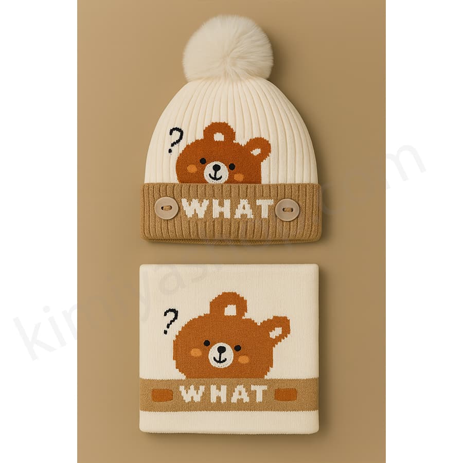 ست کلاه و شالگردن بچگانه با طراحی خرس بامزه و نوشتهی WHAT، مناسب برای کودکان ۳ تا ۹ سال. این محصول دارای آستر نرم و لطیف (پتویی) بوده و از کودک شما در برابر سرما بهخوبی محافظت میکند.